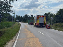Am 25.07.2025 wurden wir zu einem Einsatz auf der B16a auf Höhe von Forstpriel alarmiert. Ein Anhänger hatte dort Getreide auf der Fahrbahn verloren.